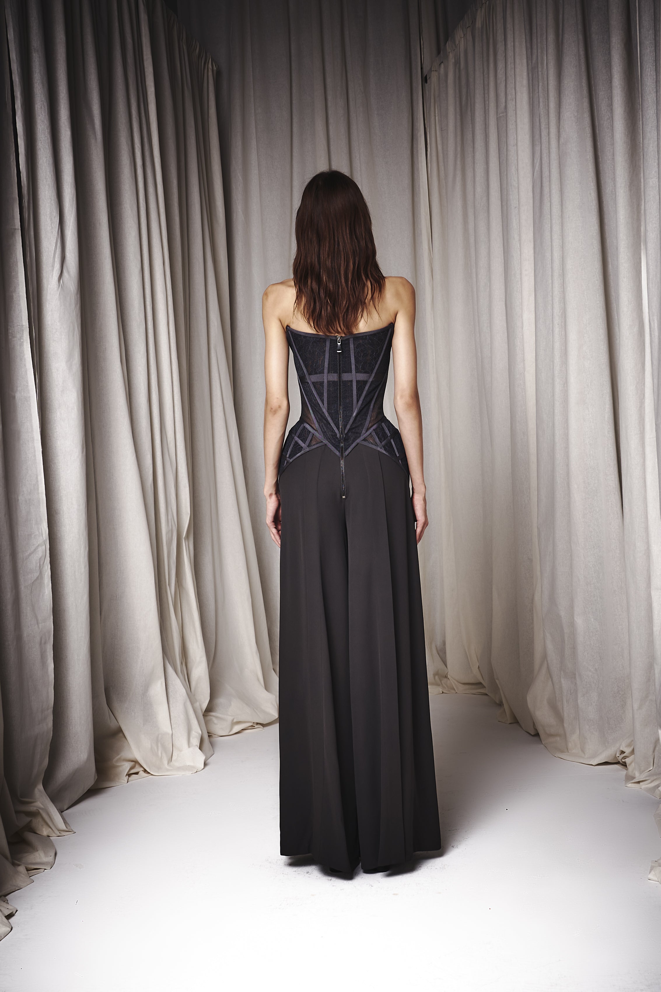 Lace corseted jumpsuit features loose cut trouser and metal zipper at the back.