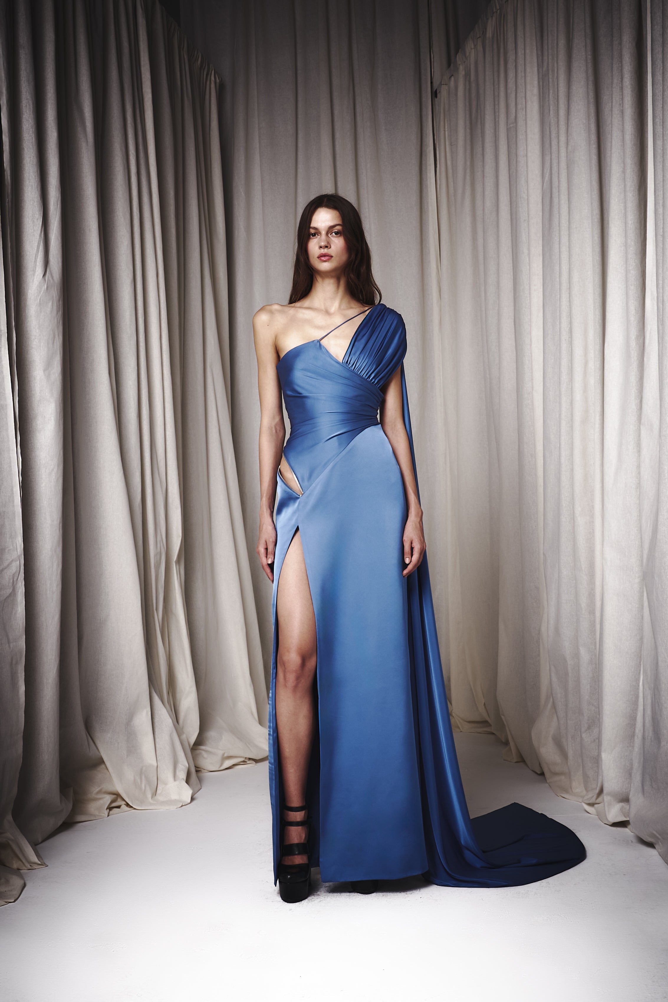 One shoulder maxi dress features draped detail, a slit at the front and metal zipper design on the side.