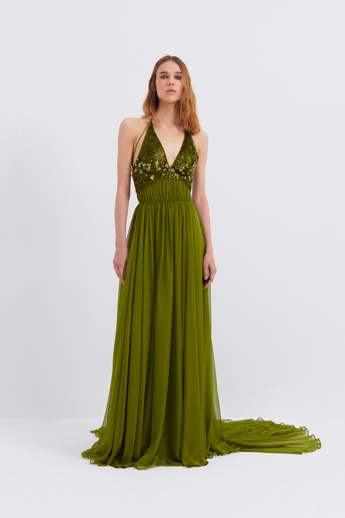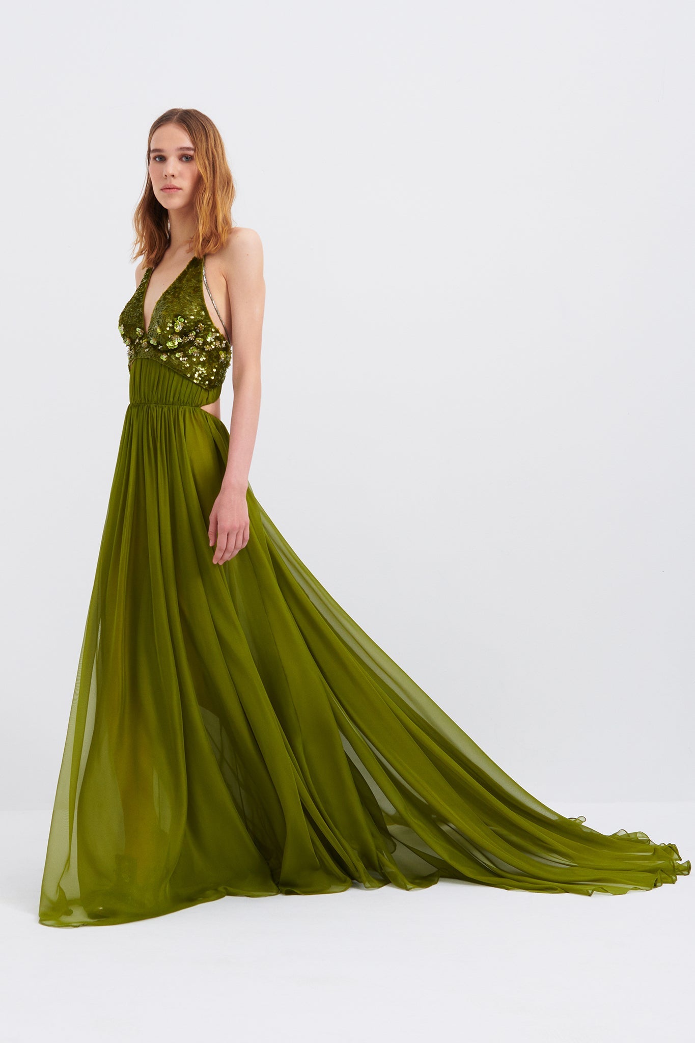 V-neck draped tailed maxi dress features bead and sequin hand-embroidery details on upper body. It fastens with a concealed back zip closure.