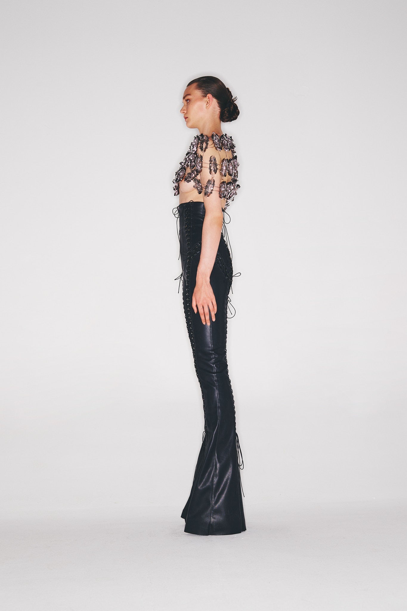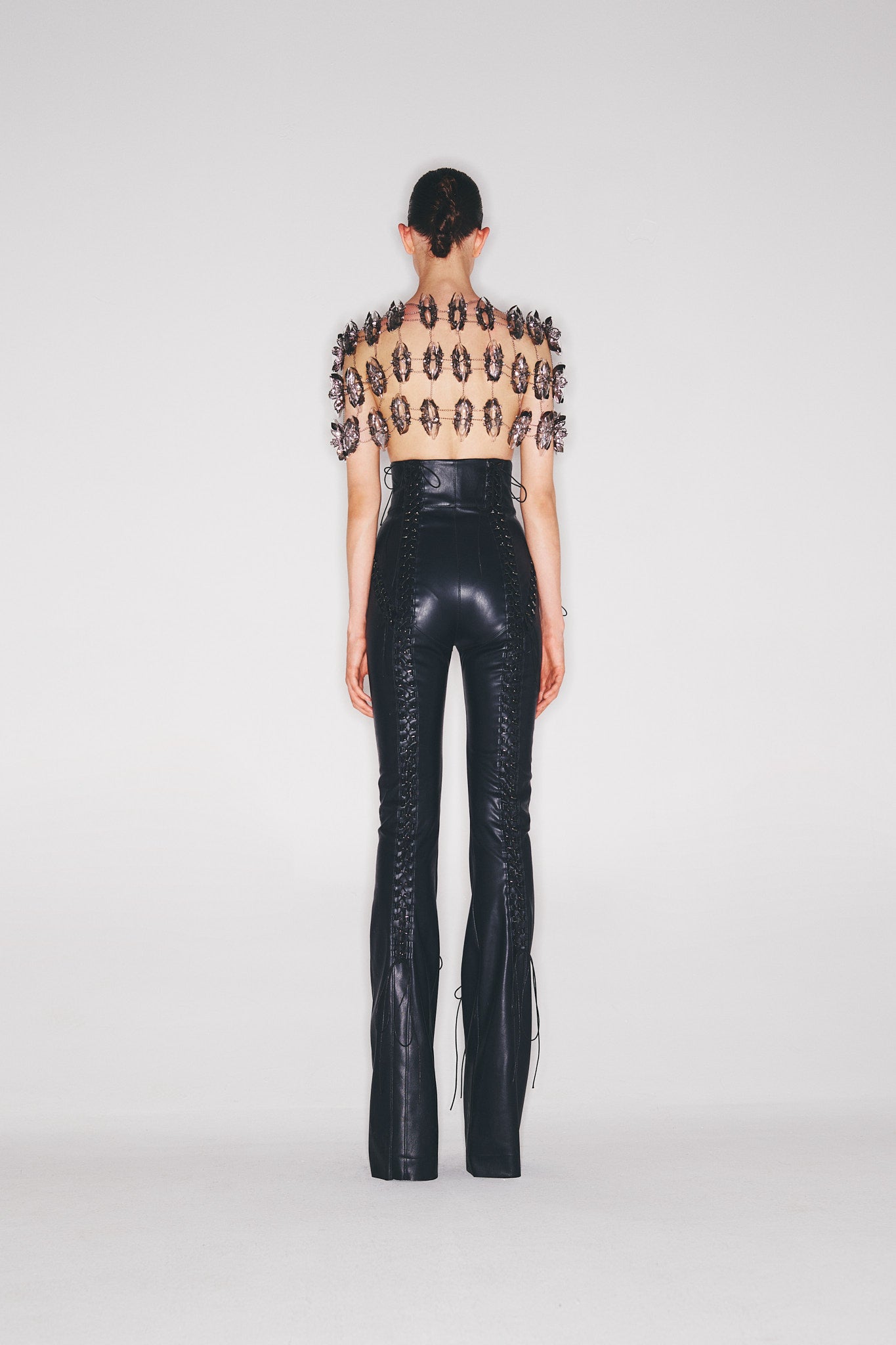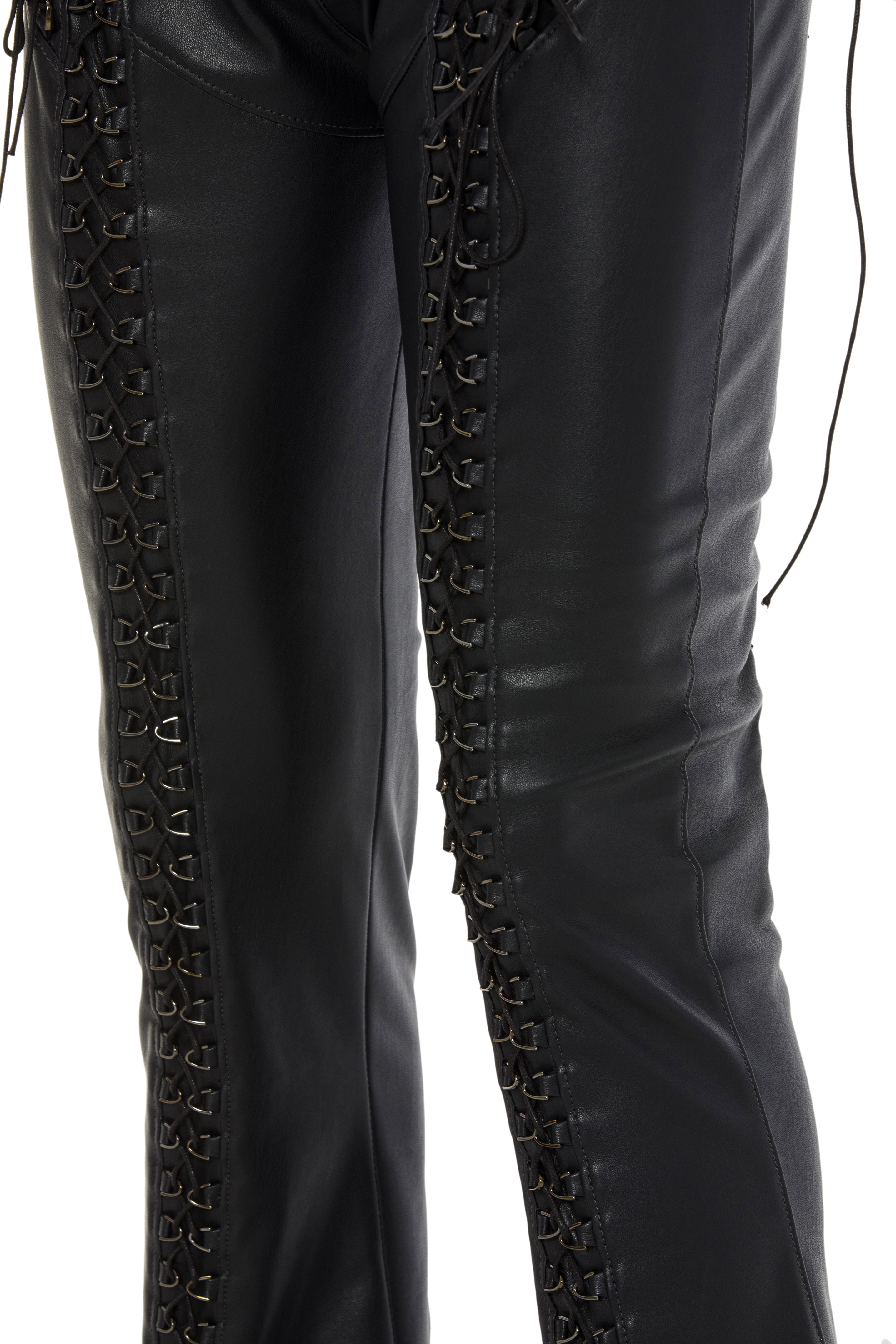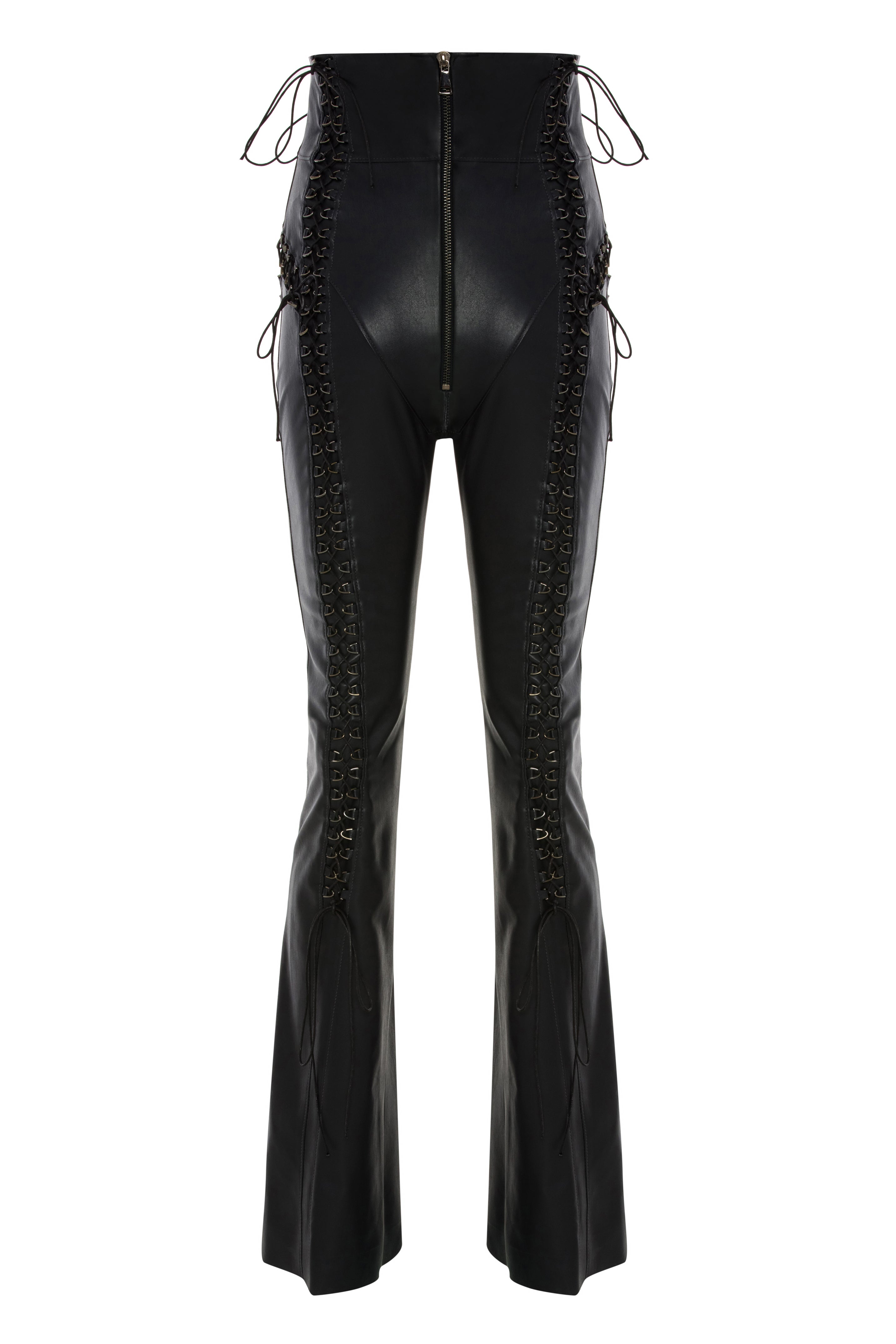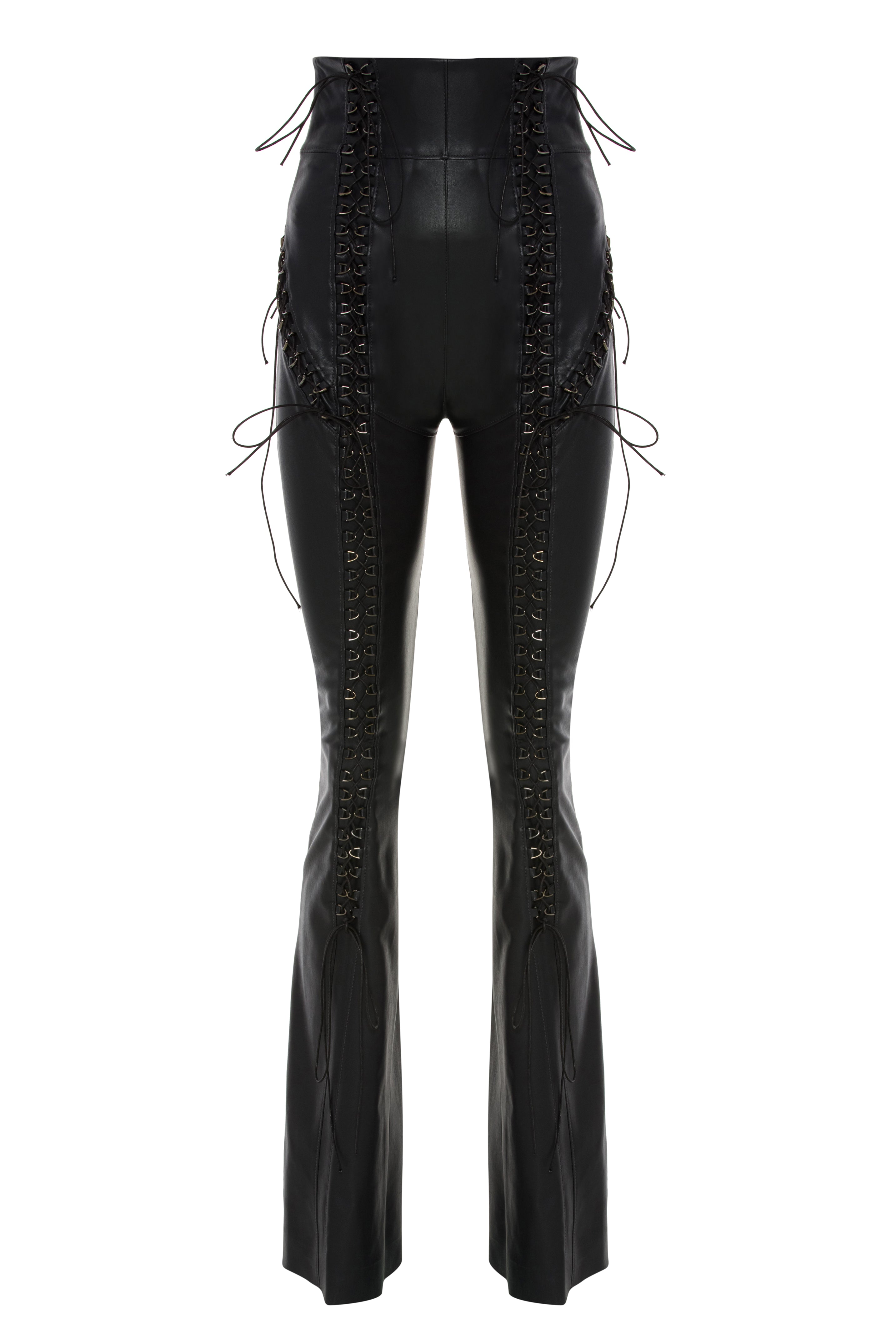 High-waisted vegan leather pants with lacing and eyelet detail.