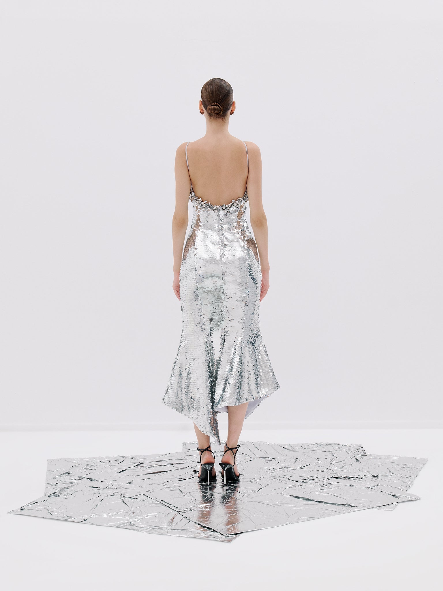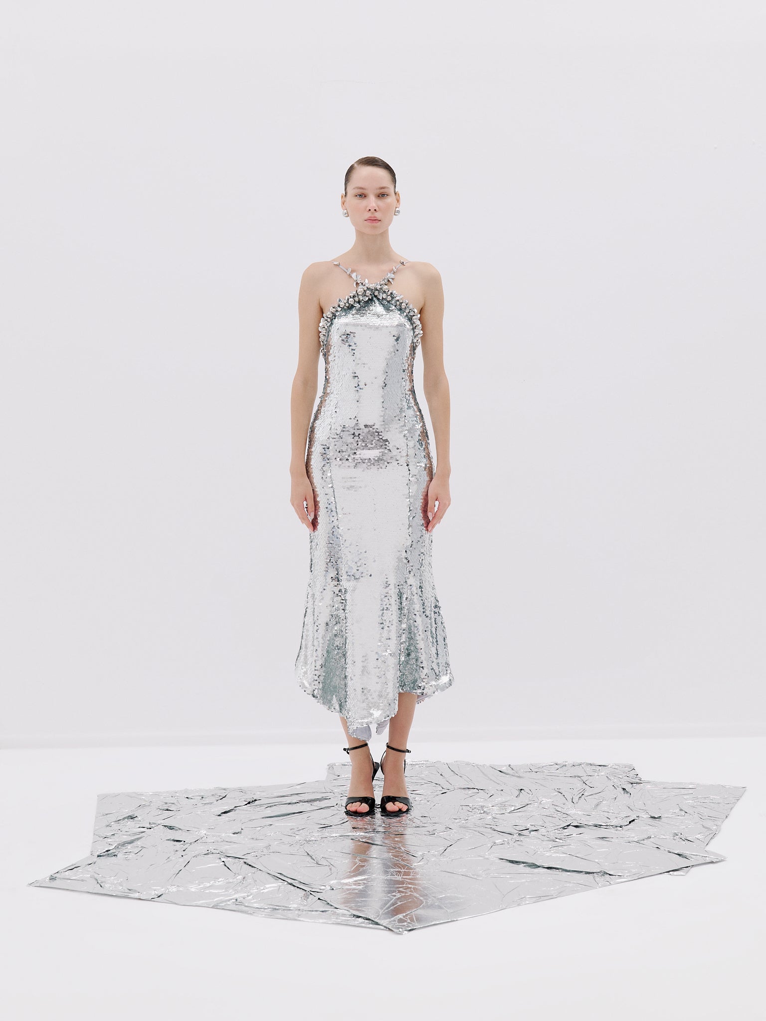 Halter dress with embellishments and a mid-lenght flared hem. The sparkling sequins create a dazzling, reflective look, making it ideal.