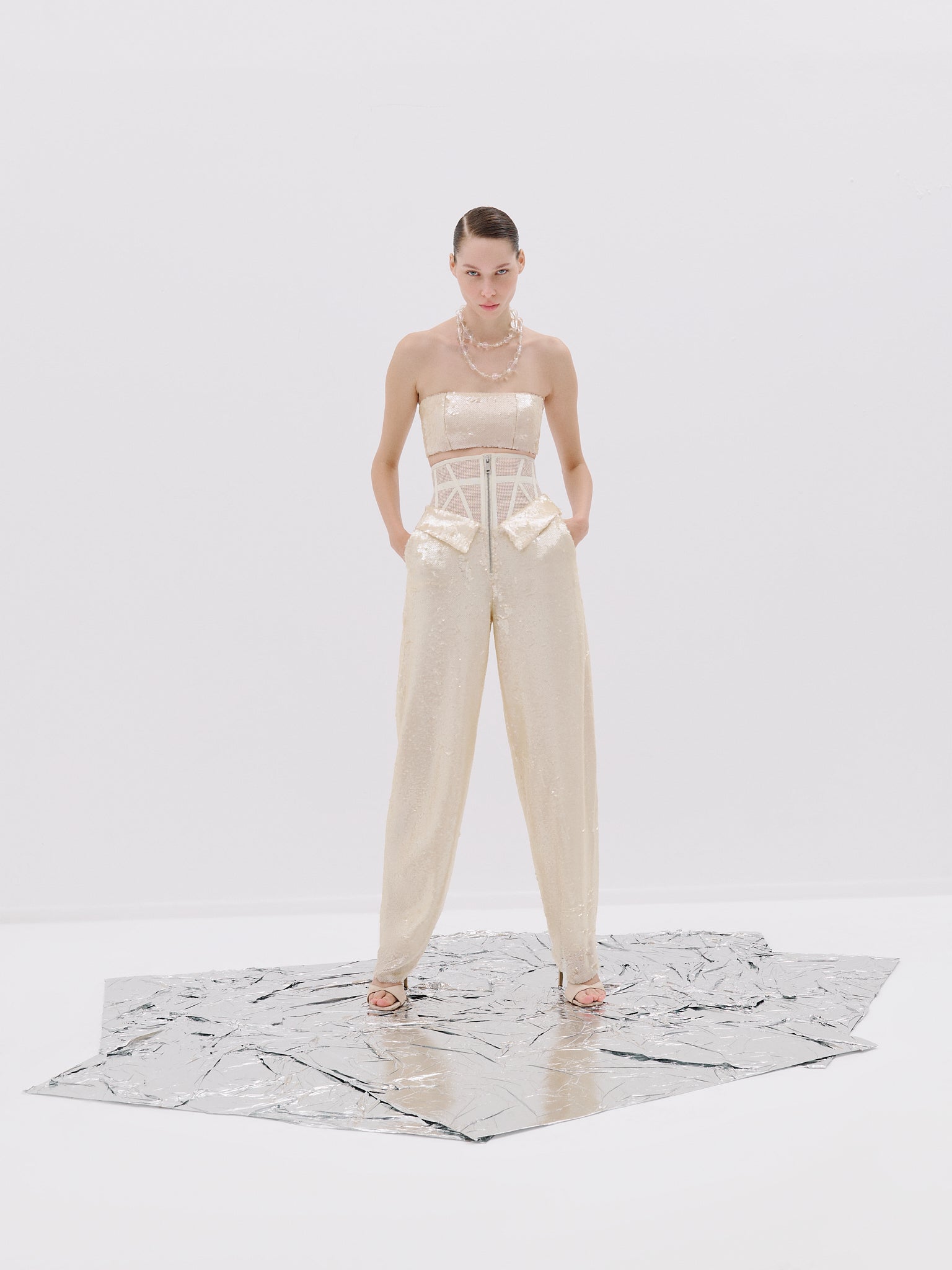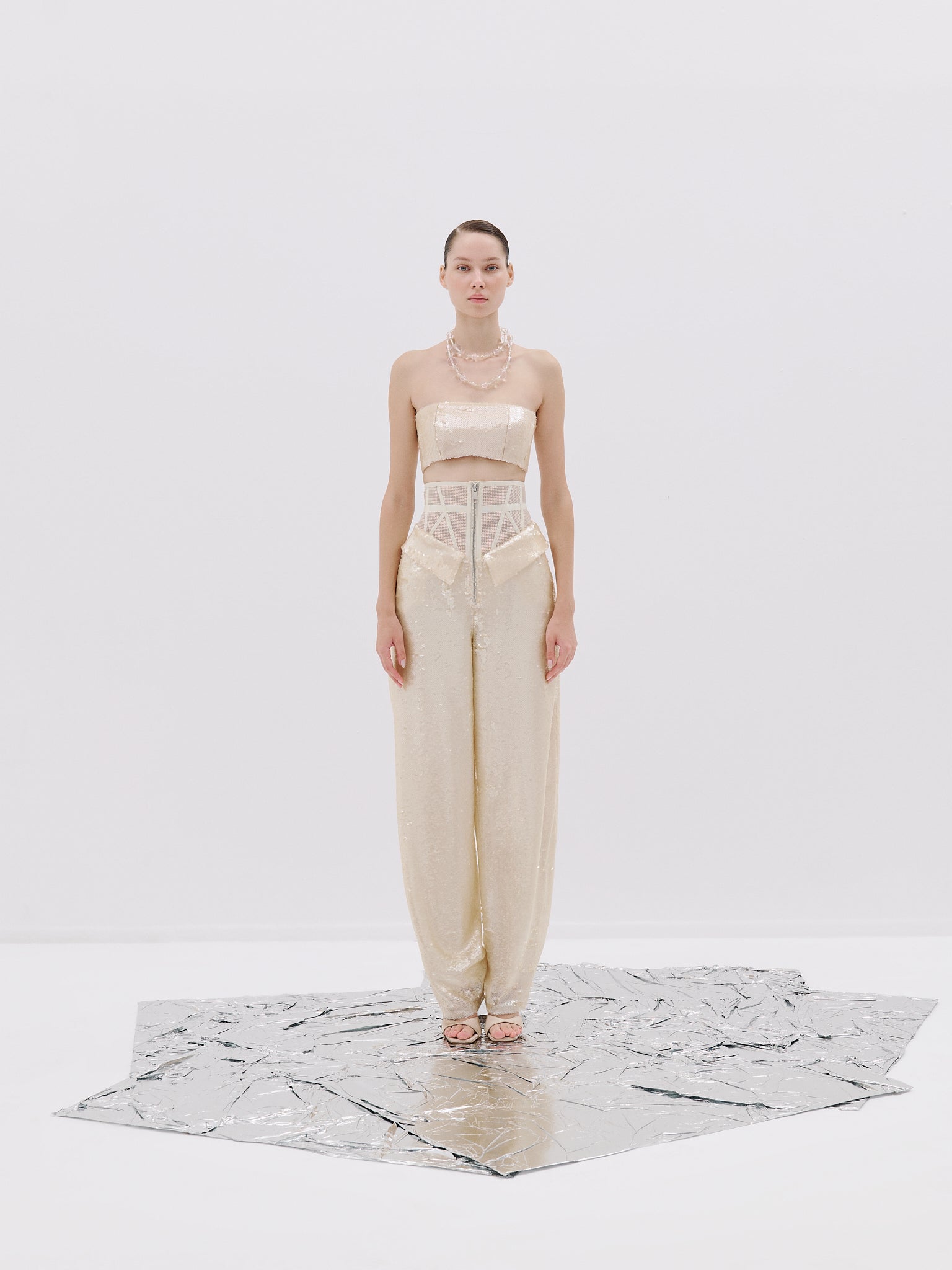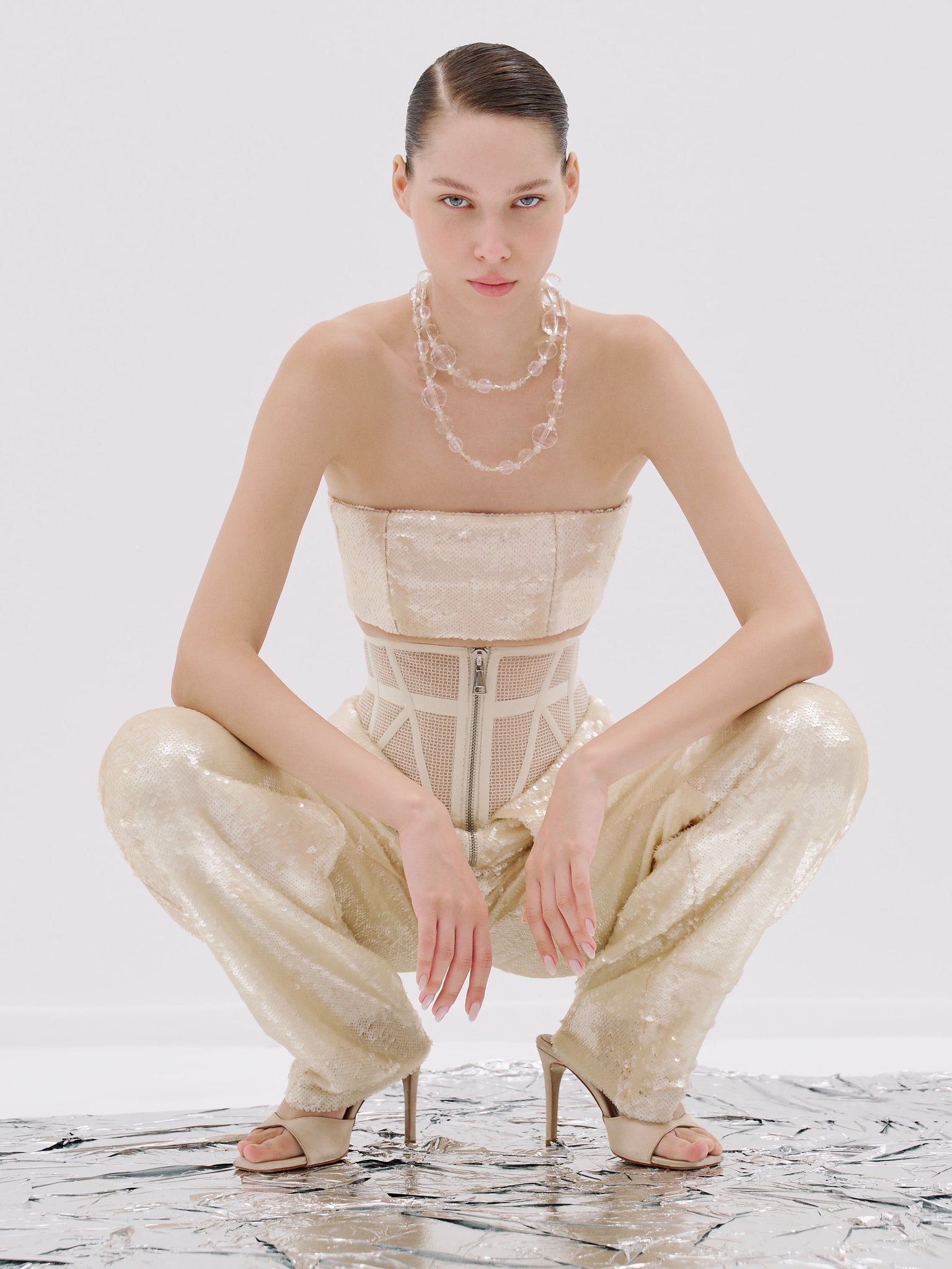 This is a strapless, cream-colored corset top with a sequined finish, giving it a glamorous and shiny appearance.